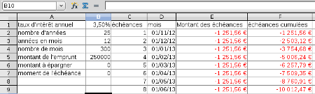 – dans la cellule D2, inscrivez la date du premier jour du premier mois de la première échéance prévue, par exemple 01/11/12,