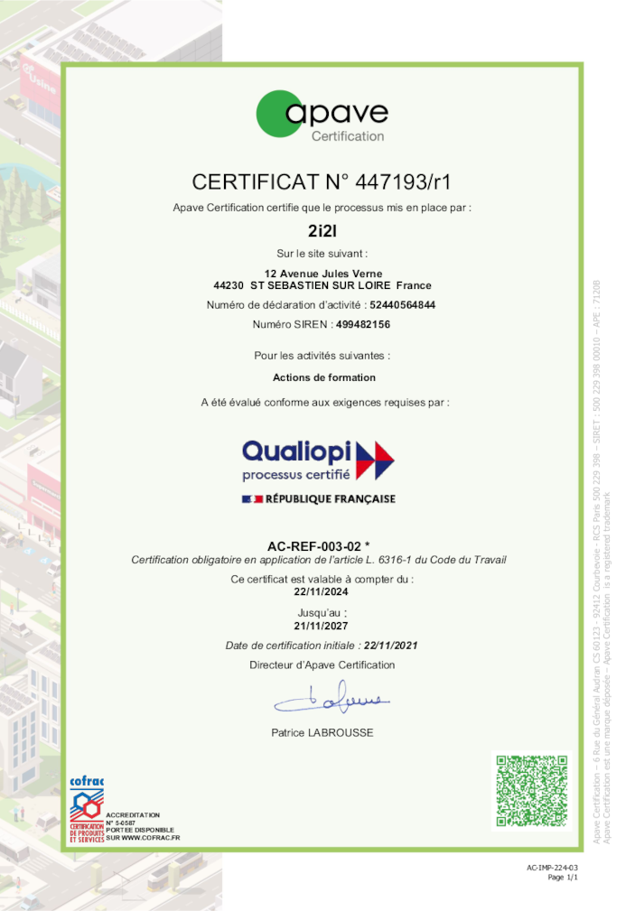 La certification qualité a été délivrée au titre de la catégorie d’actions suivante : actions de formation, par Apave Certification - 92412 Courbevoie. Certificat n°447193/r1 portant sur le référentiel AC-REF-003-02 *.