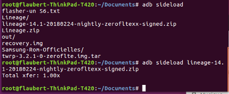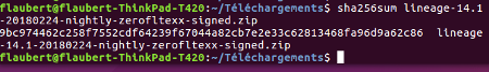 – depuis le répertoire contenant votre ROM zippée, utiliser la commande "sha256sum", VotreShellUnix$ sha256sum lineage-14.1-20180224-nightly-zerofltexx-signed.zip