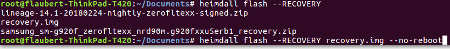 – lancer la commande #Heimdall fash —RECOVERY recovery.img —no-reboot qui pousse la ROM Custom de boot sur votre mobile