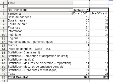 Voici le nombre de fonctions pour chaque catégorie et tableur.