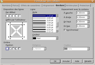 faire des bordures aux cellules, avec les icones et le menu, faire une ombre aux cellules, faire une bordure de page, dans le tableur