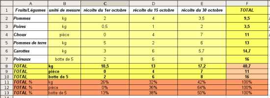 Dans cet exemple, dans la partie des pourcentages, il est nécessaire de figer la référence à la colonne "total", la colonne F, car ce sera toujours sur cette valeur que sera calculé le pourcentage.