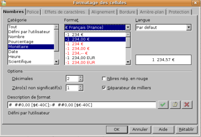 Il est possible de choisir un format monétaire de différents pays dans le menu déroulant sous Format.