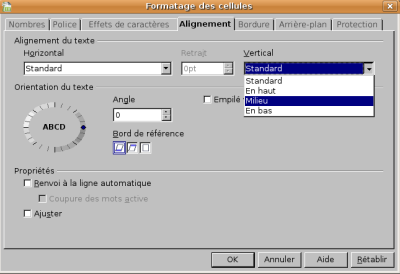 - choisissez, dans le menu, Format / Cellules / onglet Alignement / Alignement du texte - “Vertical”.