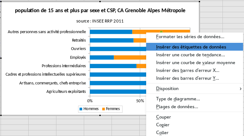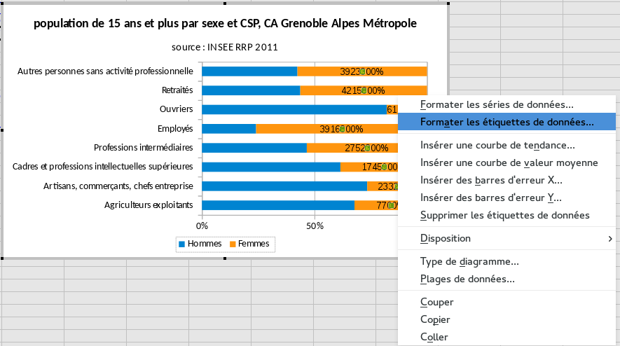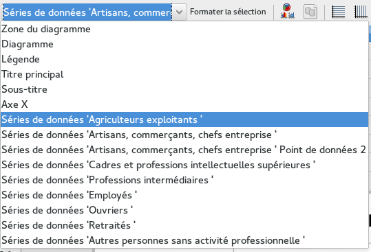 Il arrive qu’il soit impossible de sélectionner une série de données par le clic quand la valeur est infime. Il faut alors passer par le menu déroulant "Formater la sélection". Cette difficulté s’est rencontrée pour le graphique des CSP par âge :