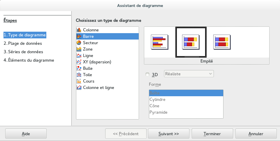 2- Choisir le diagramme en barre empilé, saisir les titres des axes et positionner la légende en "Bas".