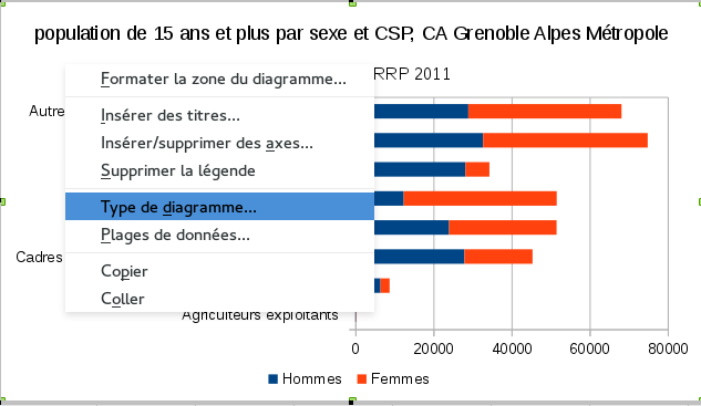 Le résultat fait apparaître des disproportions dans les valeurs et les agriculteurs ne sont pas du tout visibles ? Soit vous choisissez de mettre en évidence ces disproportions d’effectifs, soit vous souhaitez observer la répartition hommes/femmes dans chaque CSP. Dans ce dernier cas il faudra modifier le type de graphique en faisant un clic droit "Type de diagramme" et choisir "pourcentage empilé".