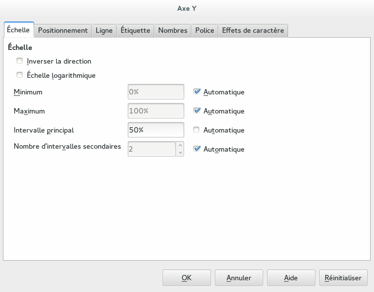 3- Modifier l’échelle de l’axe Y (celui qui affiche les %) pour n’afficher que 0%, 50% et 100% en décochant "automatique" pour l"intervalle principal" et saisir 50.