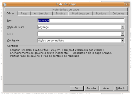 Le style “paysage” apparaît dans la liste des styles de page.