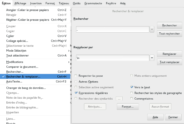 rechercher un caractère de texte et le remplacer par un retour chariot, ou retour à la ligne